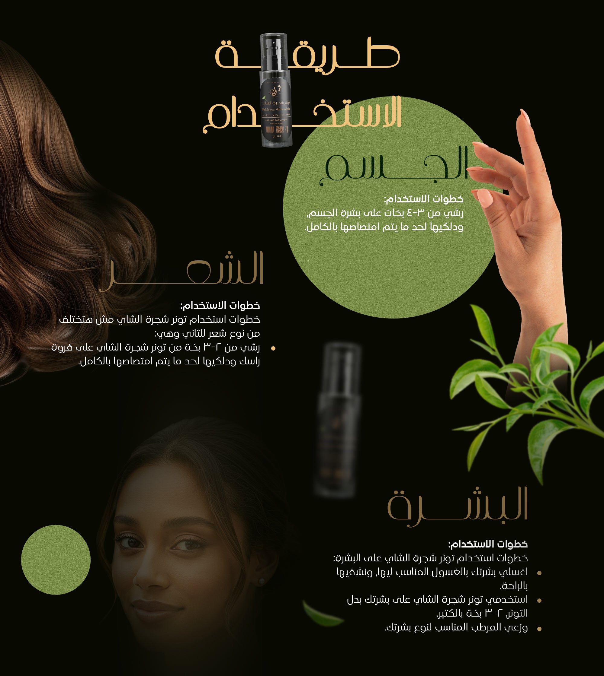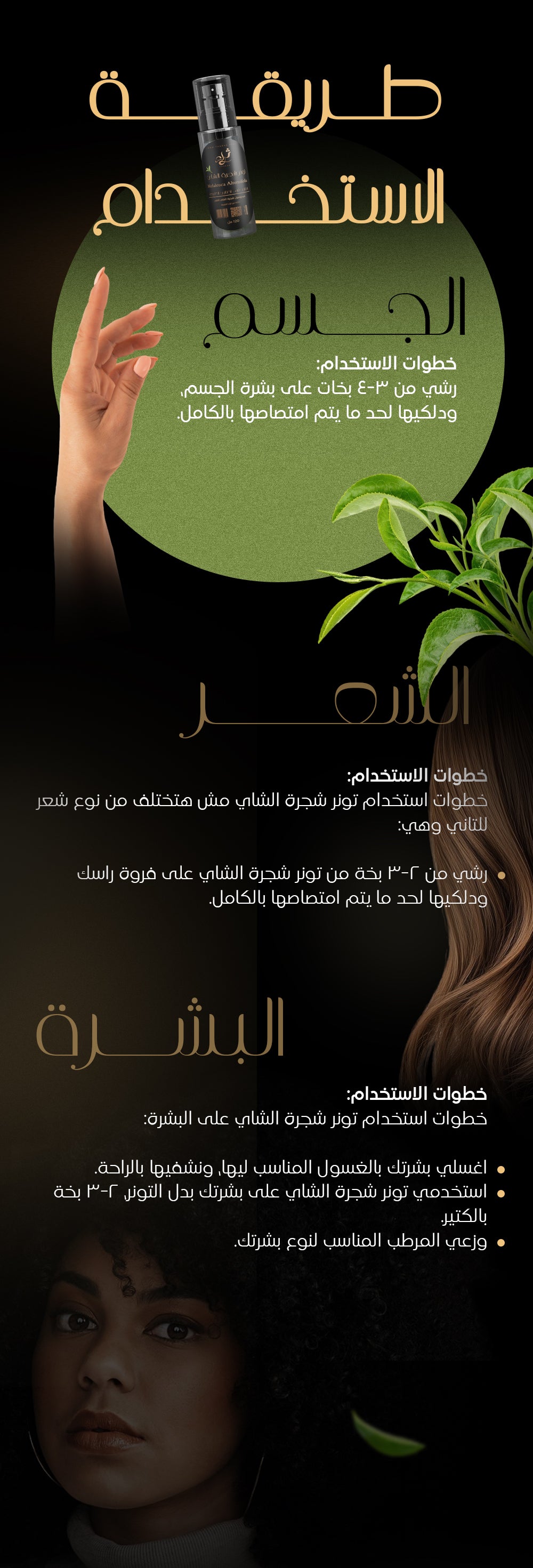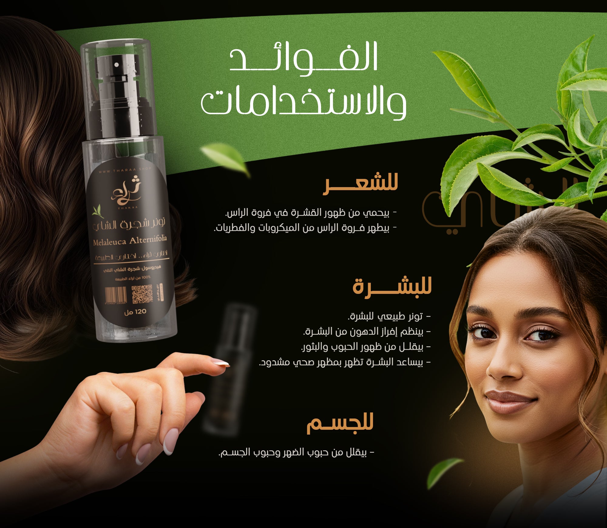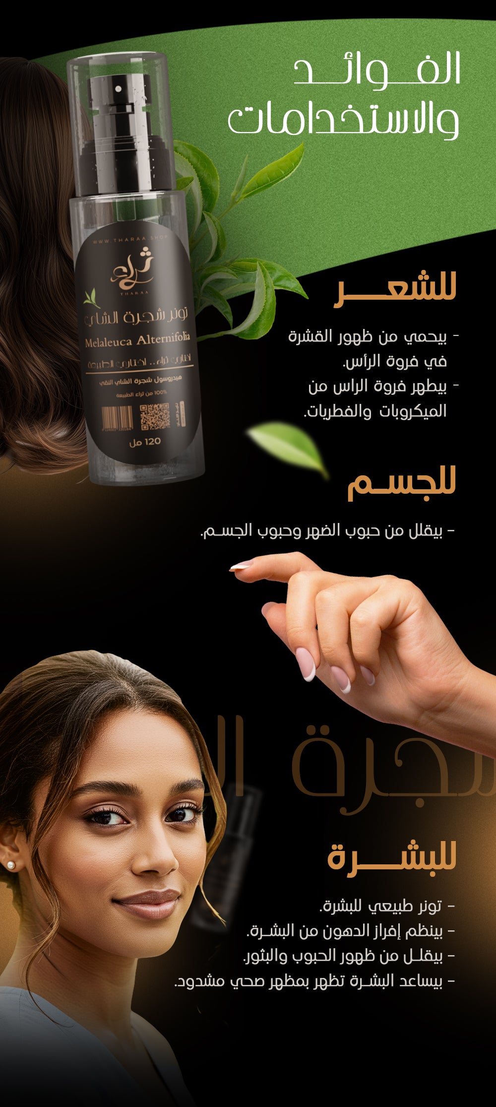 مياه شجرة الشاي النقية من ثراء طبيعية ١٠٠٪ ومحضرة من أجود أنواع أوراق نبات شجرة الشاي الطبيعية