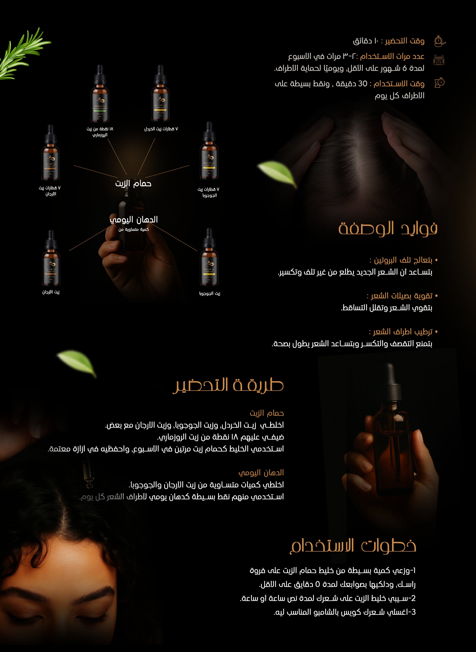 الروتين دا فيه حمّام زيت أسبوعي بيغذي الشعر، ويقوي البصيلات، ويحفز نموها من جديد، وكمان دهان يومي خفيف يحافظ على الأطراف من التقصيف والجفاف ويساعدها تطول بصحة من غير ما تتكسر وتتقطم بسبب الفرد اللي فيها.
