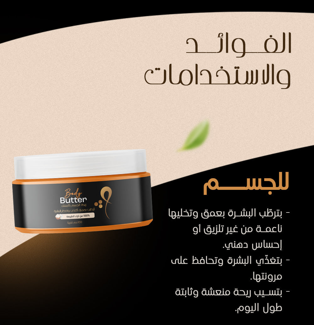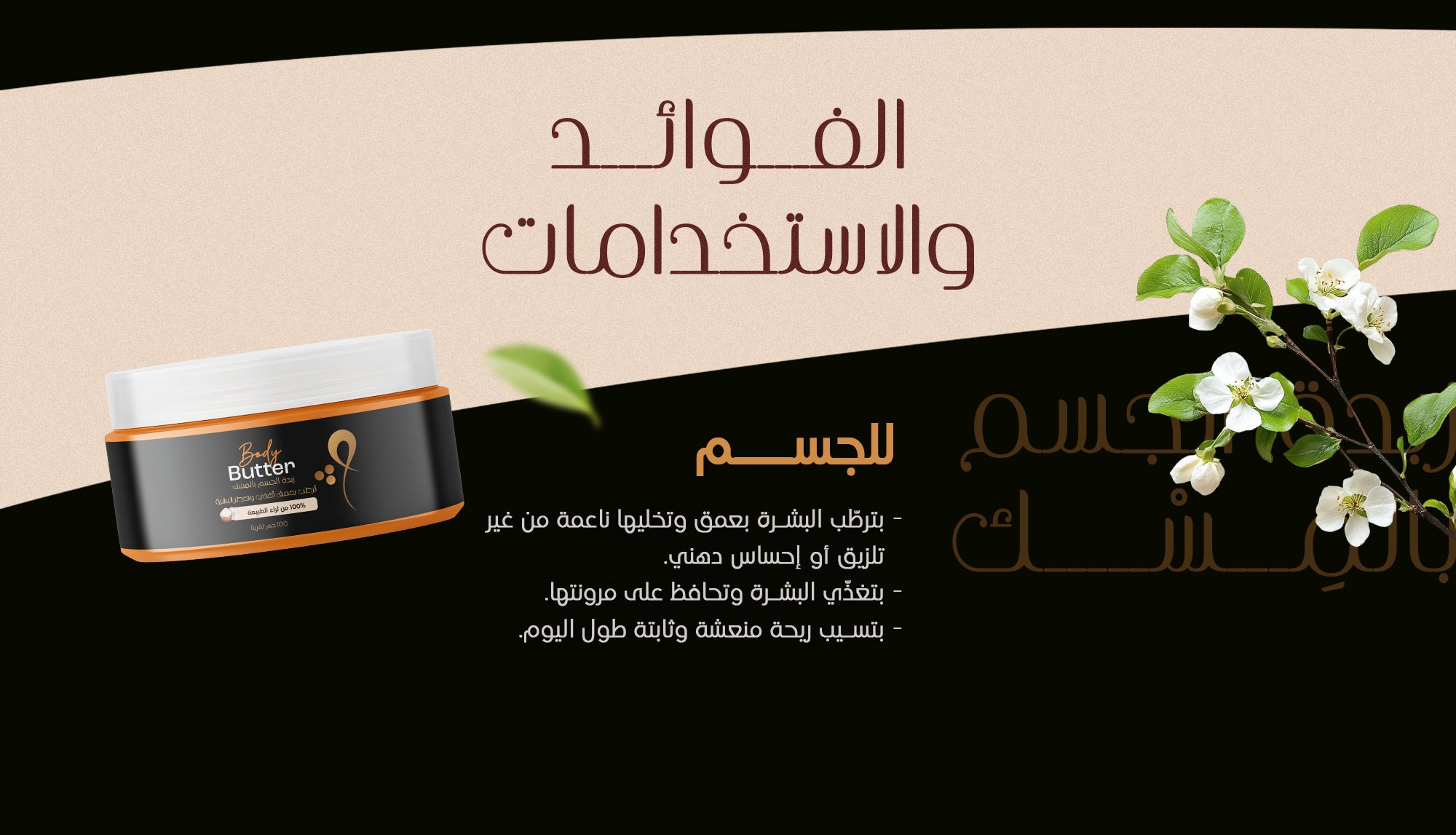 زبدة الجسم مش بس بترطّب سطح الجلد، دي كمان بتوصل للطبقات الداخلية وبترطبها بعمق، فبالتالي البشرة تفضل طرية وناعمة لفترة أطول. بتساعد على تقليل مظهر القشور والجفاف اللي بيظهر خصوصًا في الشتاء، وبتعالج التشققات اللي ممكن تبان في الكعبين أو الركب. كمان مع الاستعمال المستمر، زبدة الجسم بتخلي الجلد مرن وأقل عرضة إنه يتشقق أو يظهر فيه خطوط وعلامات التمدد.