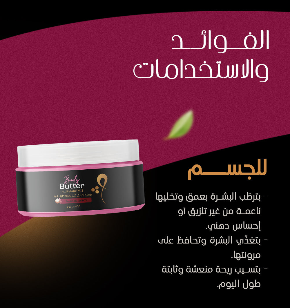 زبدة الجسم مش بس بترطّب سطح الجلد، لكنها كمان بتوصل للطبقات العميقة وبتدي ترطيب مكثف يخلي البشرة أنعم وأطرى لفترة طويلة. بتقلل من مظهر الجفاف والقشور خصوصًا في الشتاء، وبتساعد في علاج التشققات اللي بتظهر في الكعبين والركب. ومع الاستخدام المنتظم، البشرة بتبقى أكتر مرونة وأقل عرضة لظهور التشققات أو علامات التمدد.