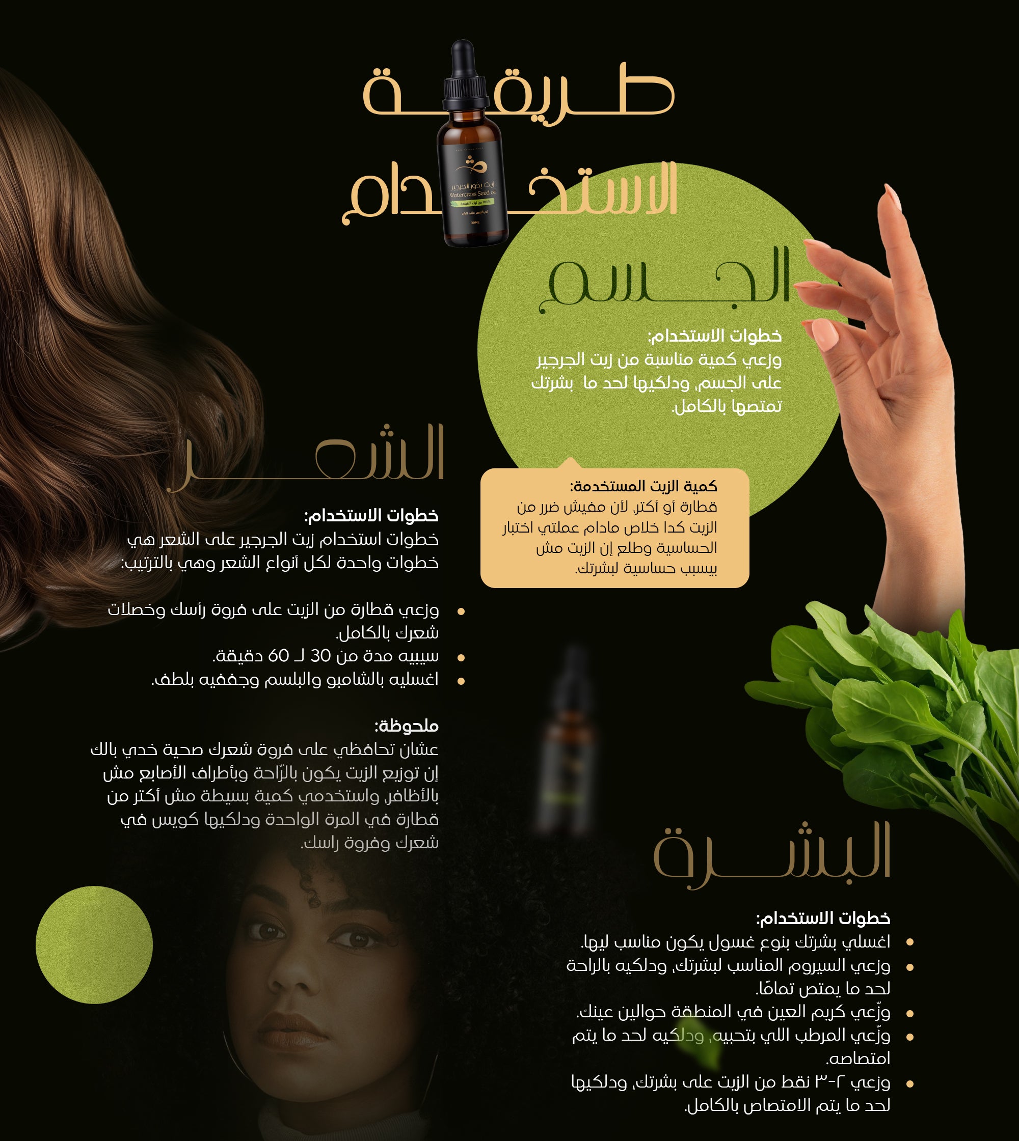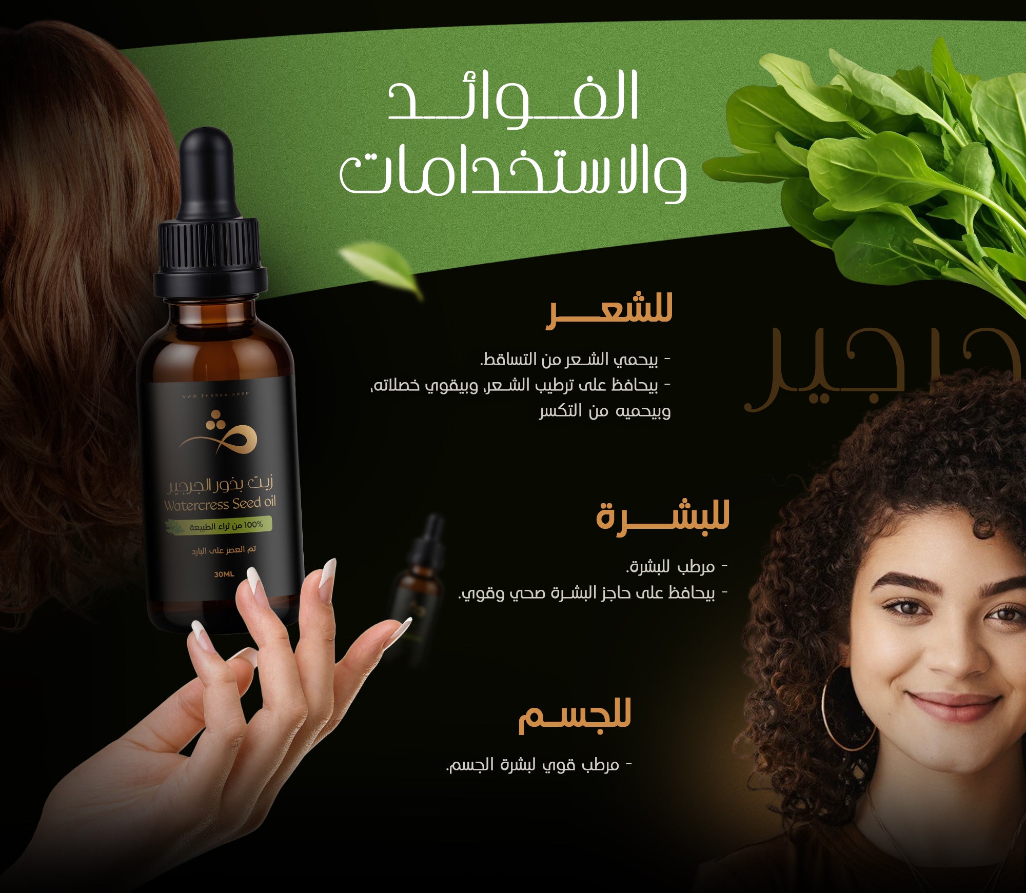 - الأحماض الدهنية: يحتوي زيت الجرجير على أحماض الأوميجا، اللي ليها دور مهم في ترطيب الشعر والبشرة، والحفاظ على حاجز البشرة صحي ومترطب.