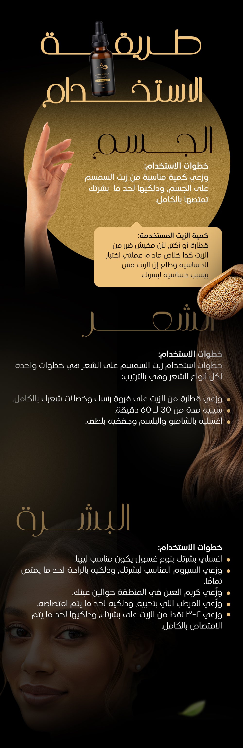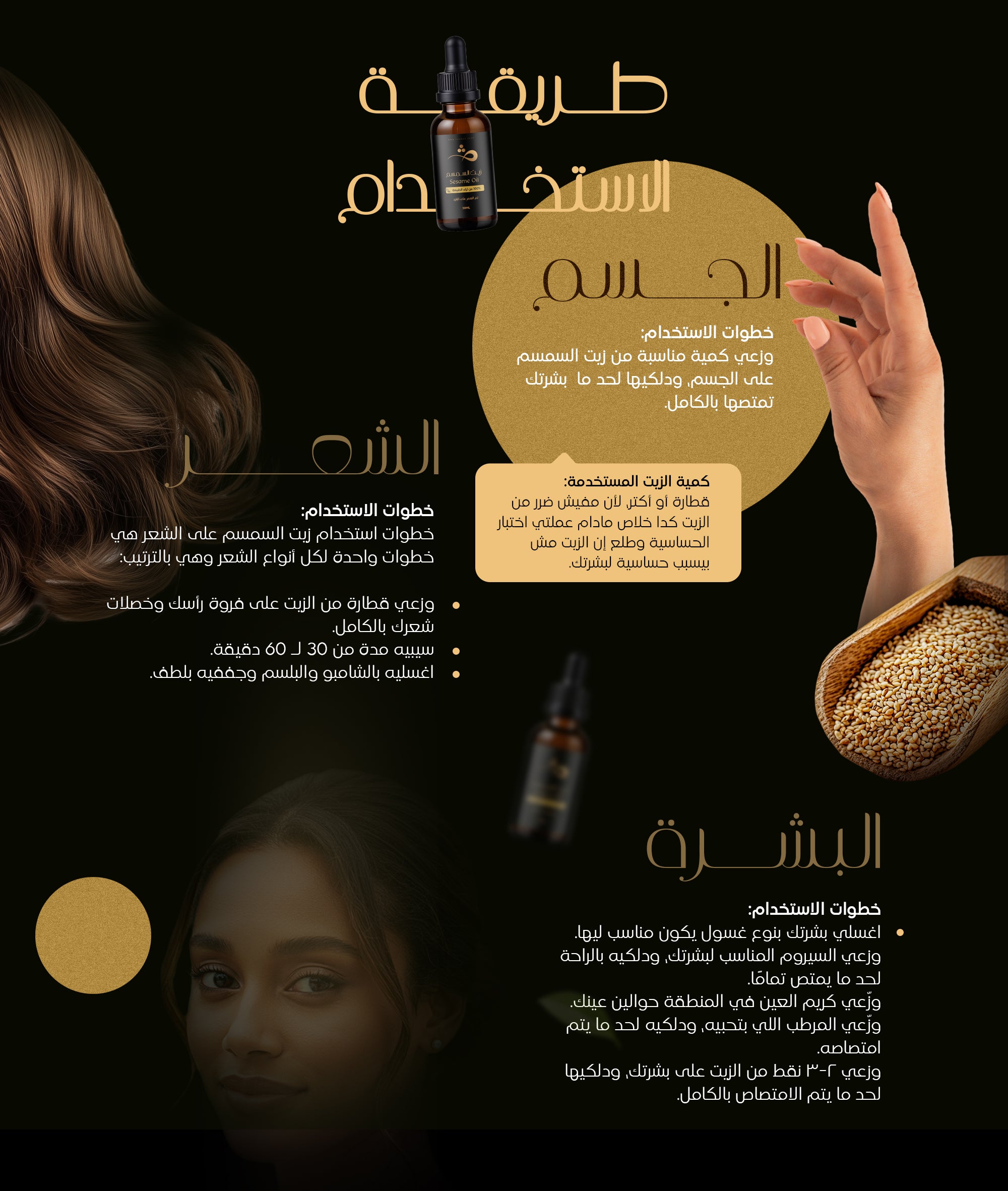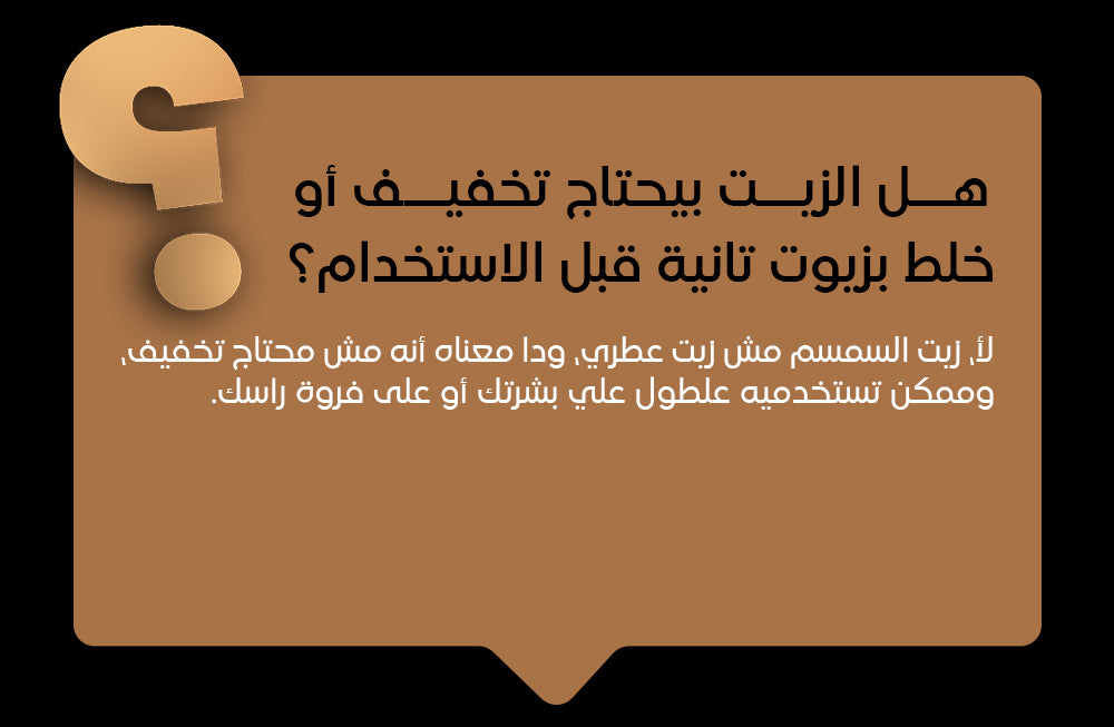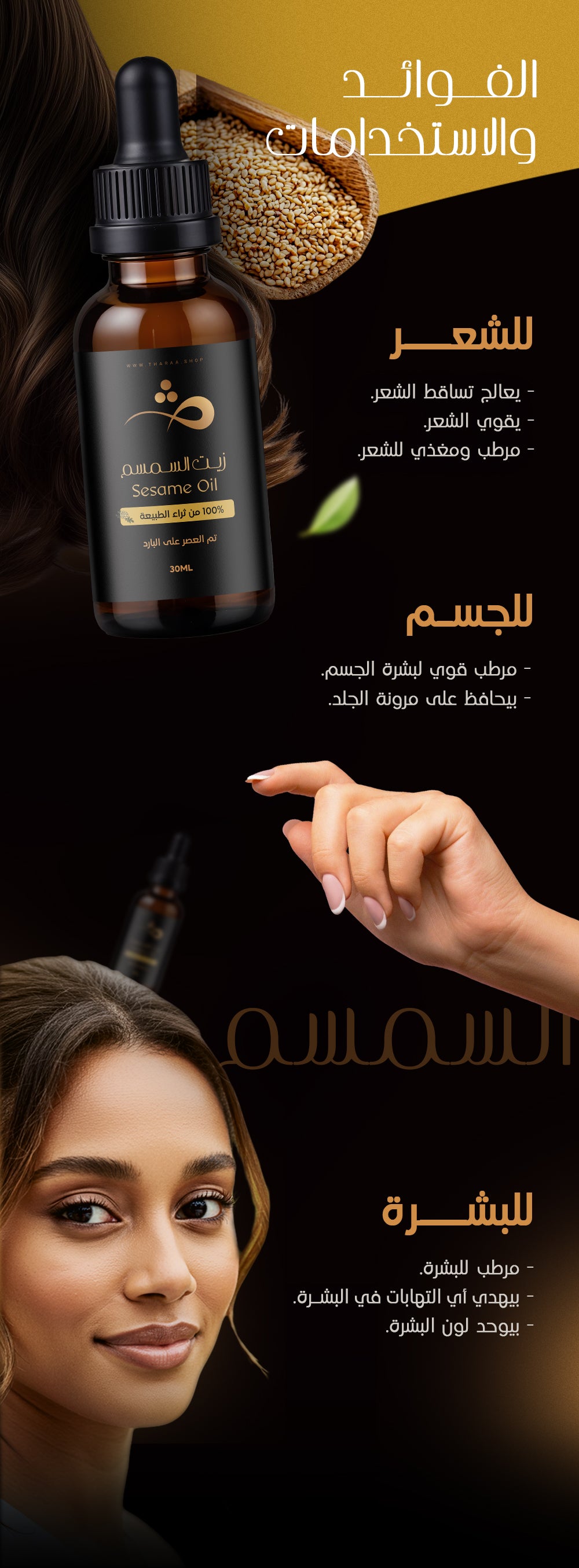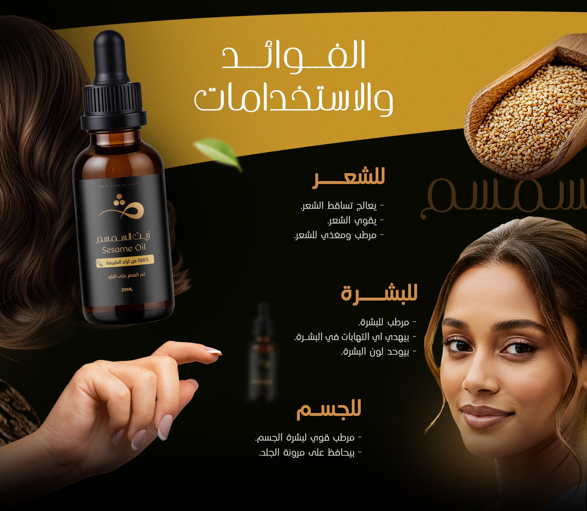 - حمض الأوليك: يعتبر زيت السمسم من الزيوت المطرية للشعر، ودا معناه أنه بيساعد على تنعيم بشرتك وبيخلي خصلات شعرك مُرطبة وناعمة وصحية.