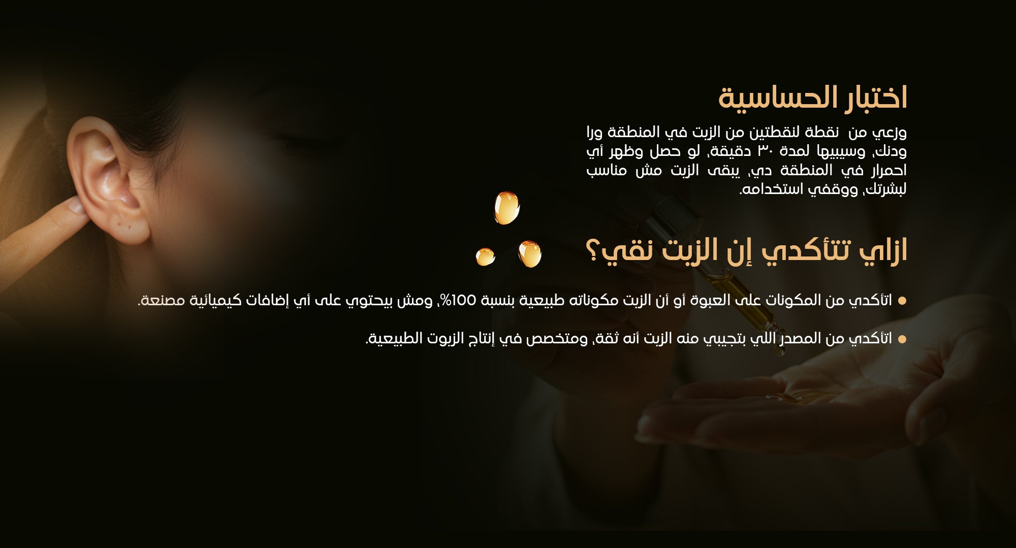 ممكن تستخدمي زيت العرقسوس لتفتيح المناطق الحساسة بصورة طبيعية ١٠٠٪، لكن ضروري أنك تخففيه الأول بزيت ناقل مناسب لطبيعة بشرتك زي زيت الجوجوبا أو بذور العنب لأنه زيت العرقسوس من ثراء عطري وتركيزه عالي جدًا من المركبات العطرية عشان كدا استخدامه مباشرة على البشرة ممكن يسبب التهابها في بعض الأحيان.