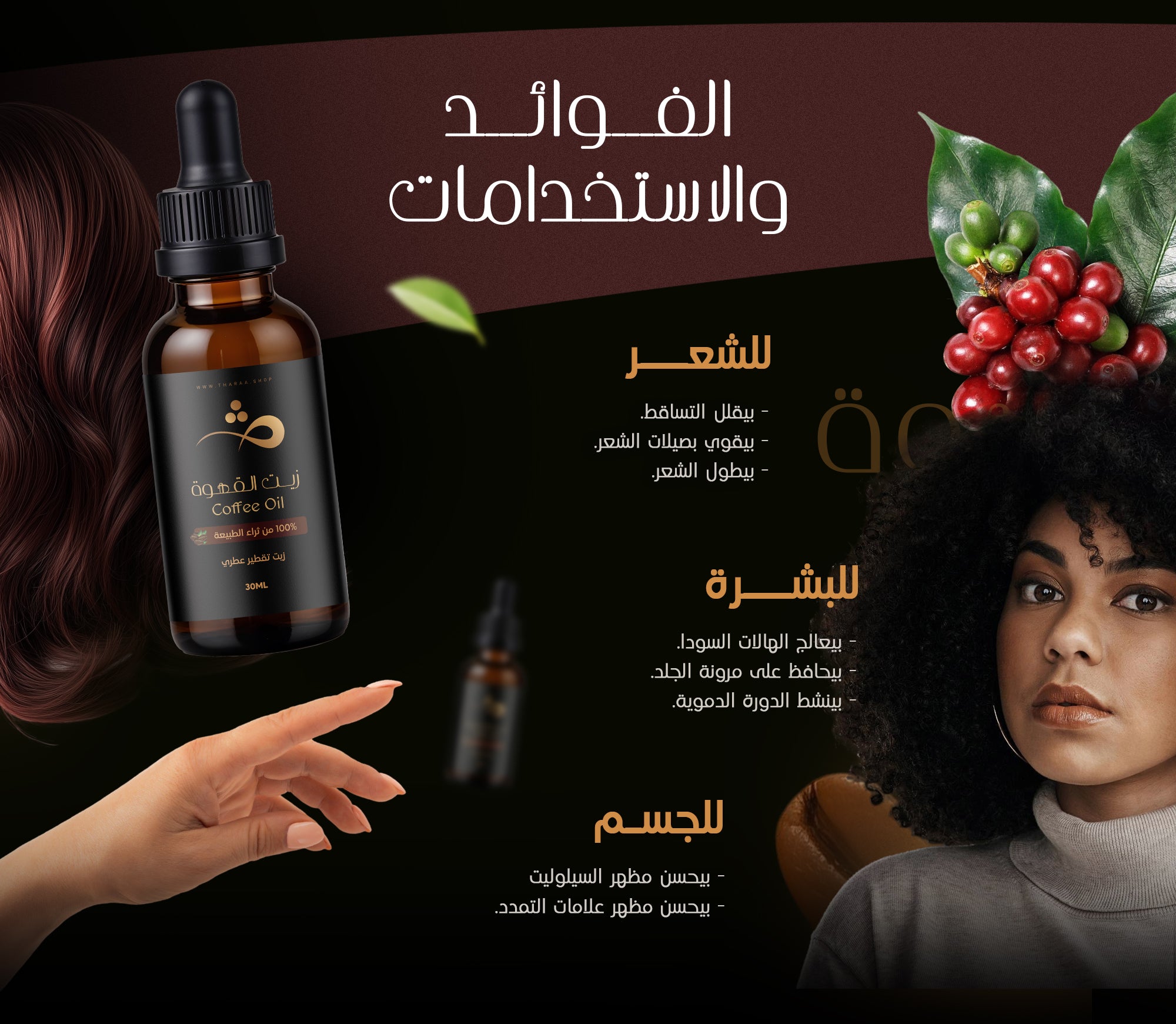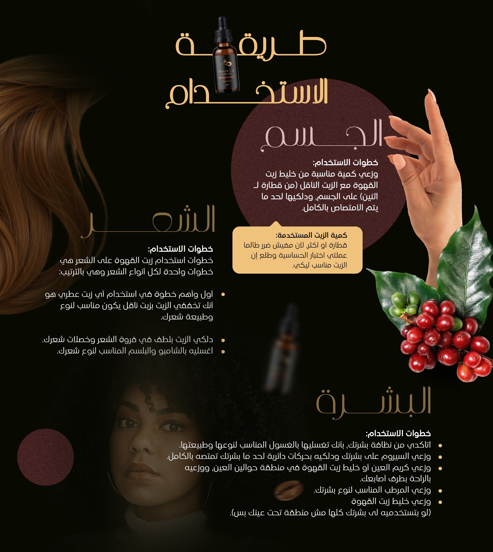 • مضادات الأكسدة: زيت القهوة بيحتوي على مضادات الأكسدة، زي حمض الكلوروجينيك والتوكوفيرول (فيتامين E)، ودا بيساعد في حماية الجلد والشعر من أضرار الجذور الحرة.