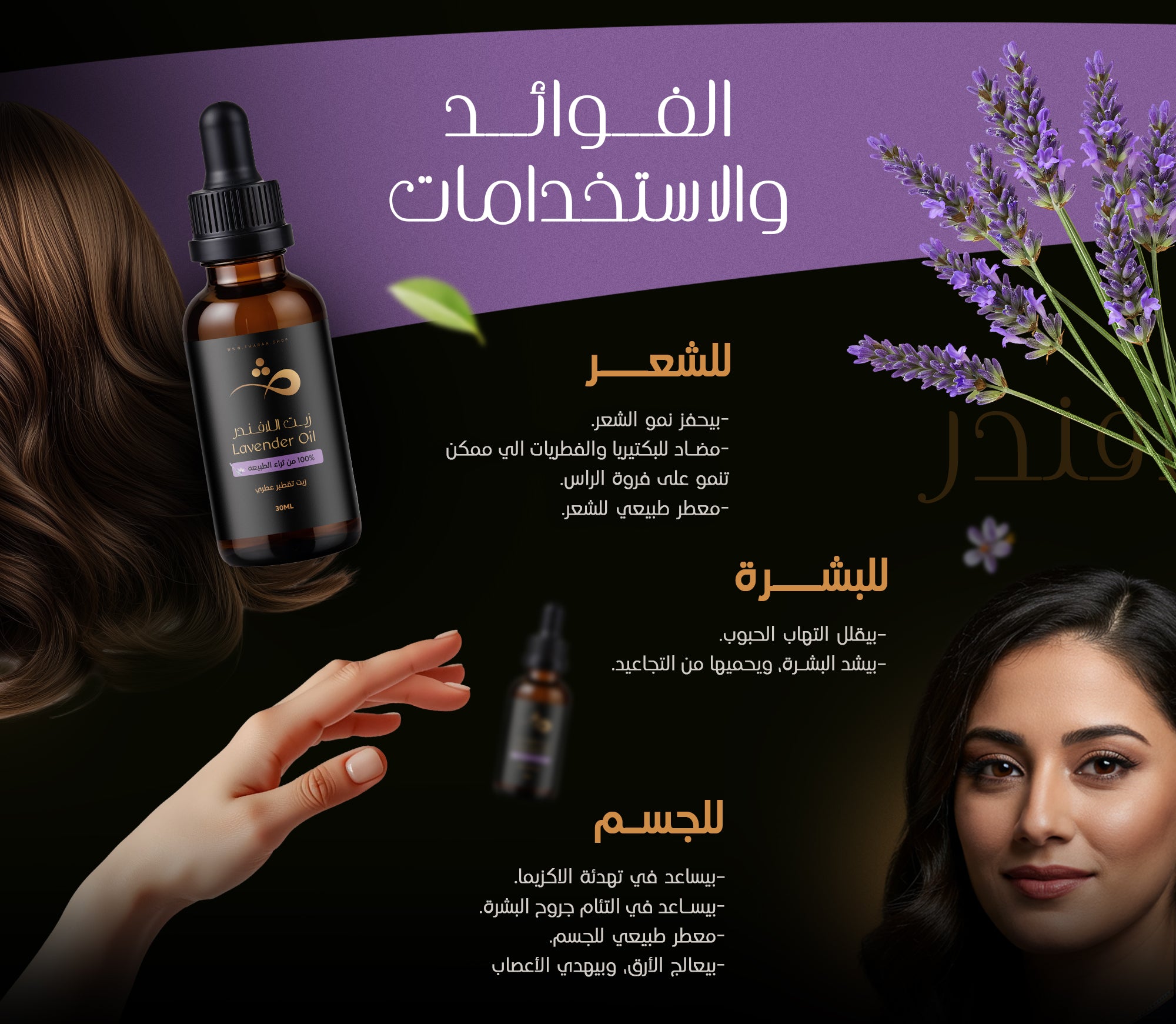 زيت اللافندر بيحتوي على مجموعة من المكونات العطرية والفيتامينات المفيدة للشعر وللبشرة، من أهمها: