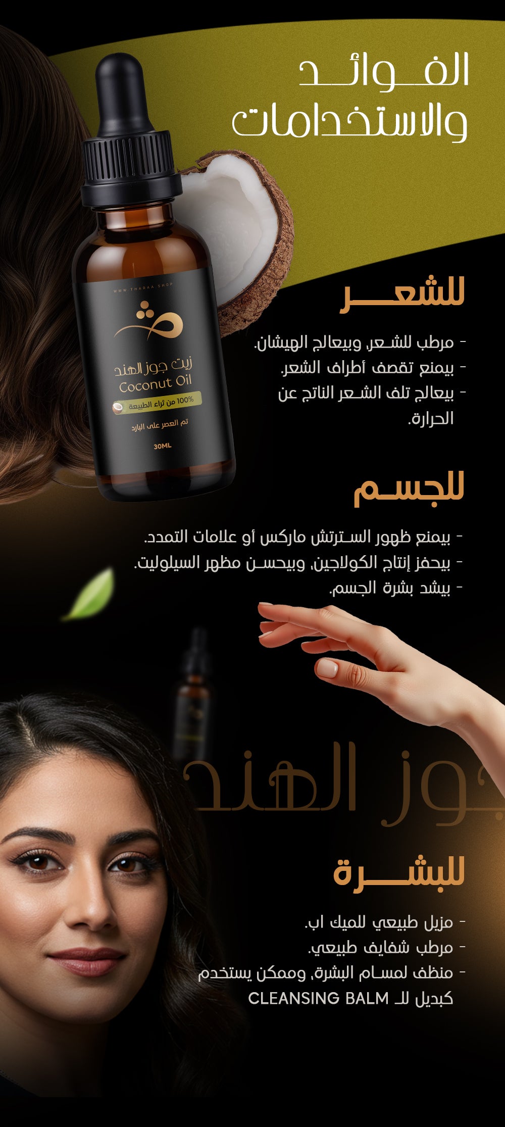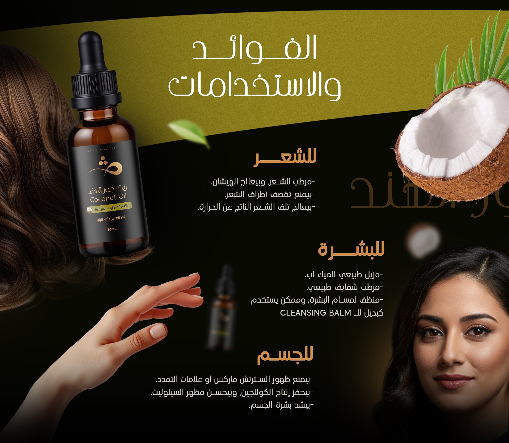 زيت جوز الهند بيحتوي على مجموعة من الأحماض الدهنية والفيتامينات ومضادات الأكسدة المفيدة للشعر وللبشرة، من أهمها: