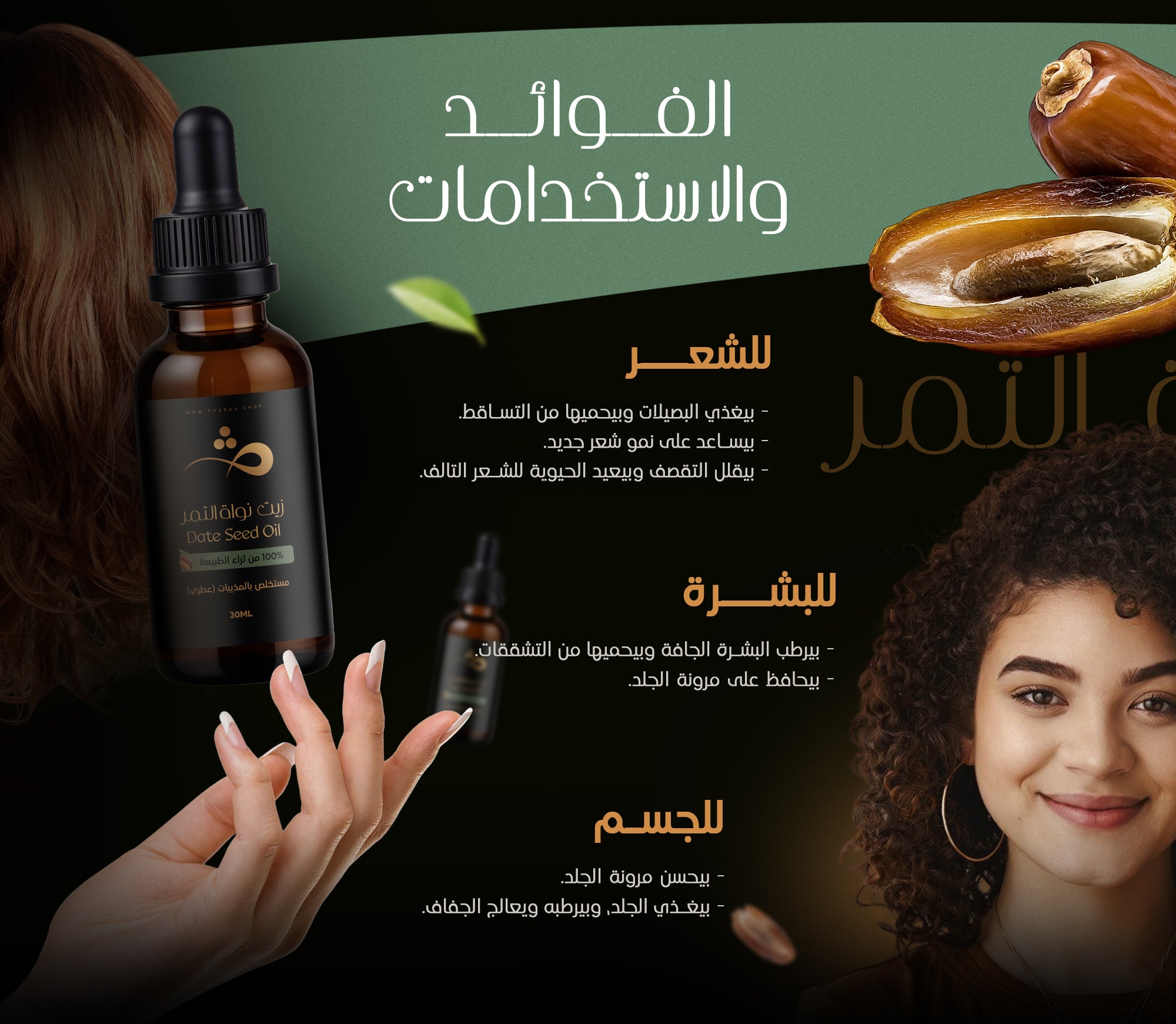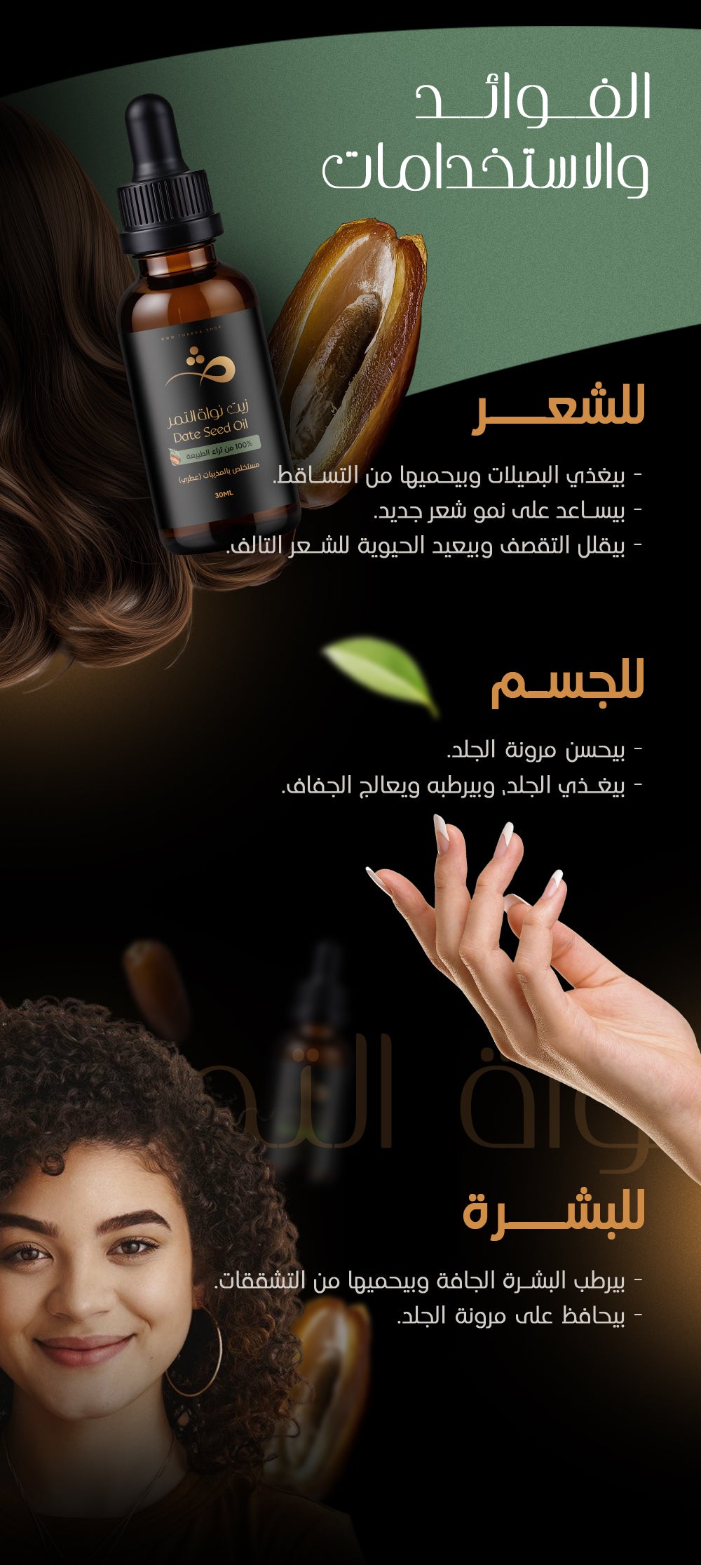 زيت نواة التمر غني بمكونات طبيعية فعالة بتغذي الشعر وتحافظ على صحته، وأهمها: