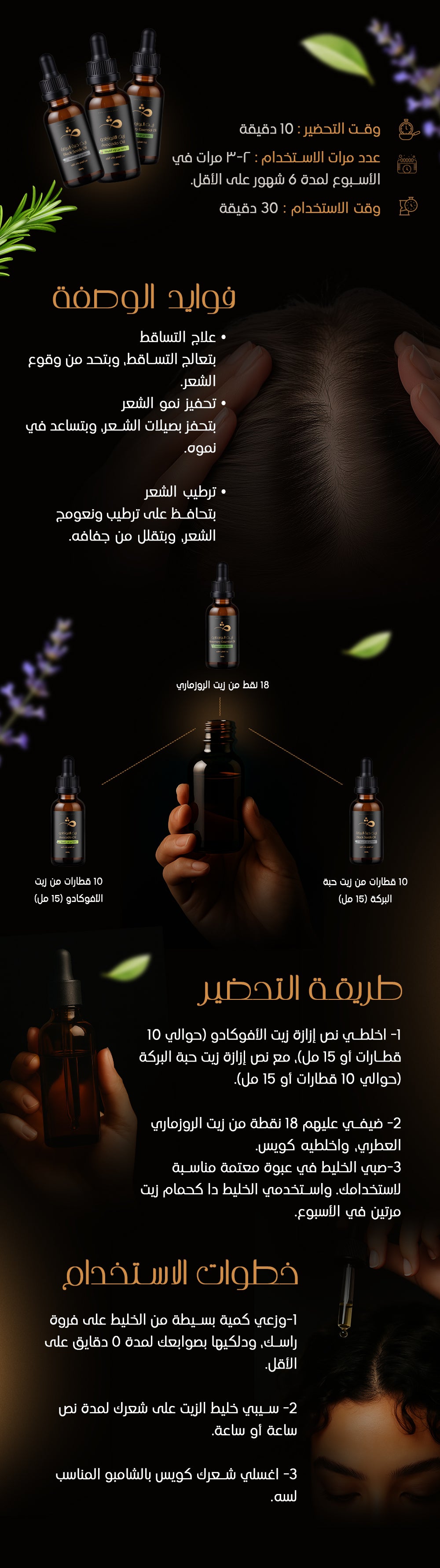 زيت حبة البركة بيحتوي على مجموعة متنوعة من البروتينات وهو مصدر غني للفيتامينات ب1، ب2، ب3، وحمض الفوليك، والكالسيوم، والحديد، والنحاس، والزنك، والفوسفور، وأوميغا 6 + 9 - وكلها بتساعد على تغذية وتقوية الشعر وترطيبه وتنعيمه.