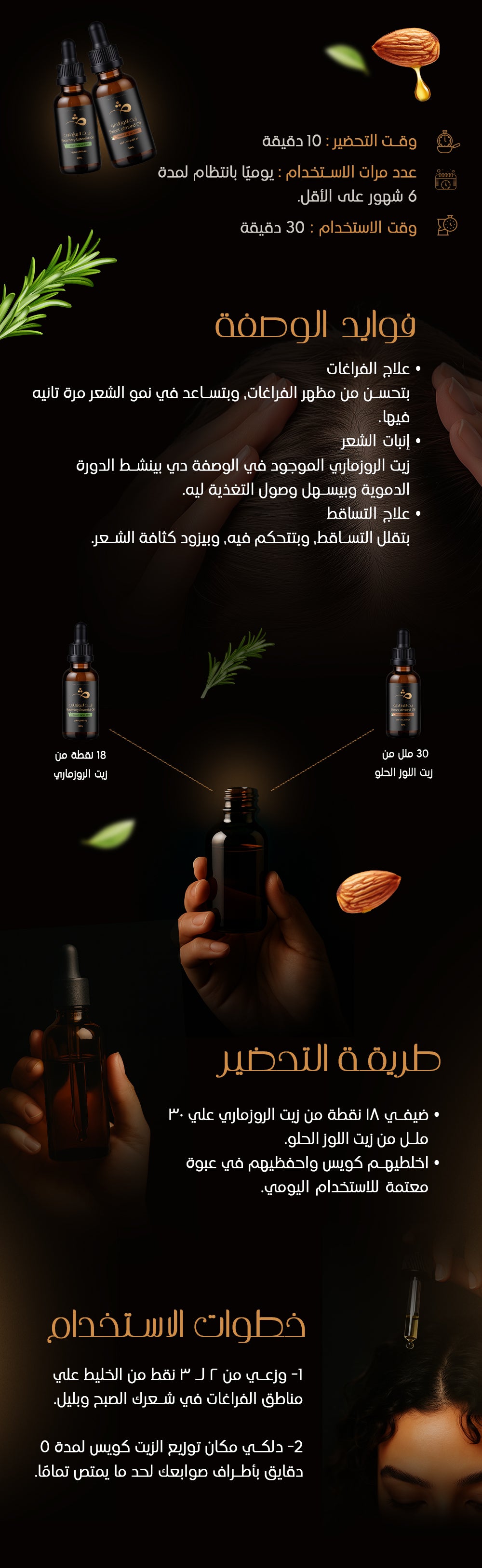 زيت الروزماري بيحمي الشعر من التقصف والتلف، ومع الاستخدام المنتظم ليه هتلاحظي أن خصلات شعرك بقت أقوى، وشعرك عمومًا بقى صحي أكتر.