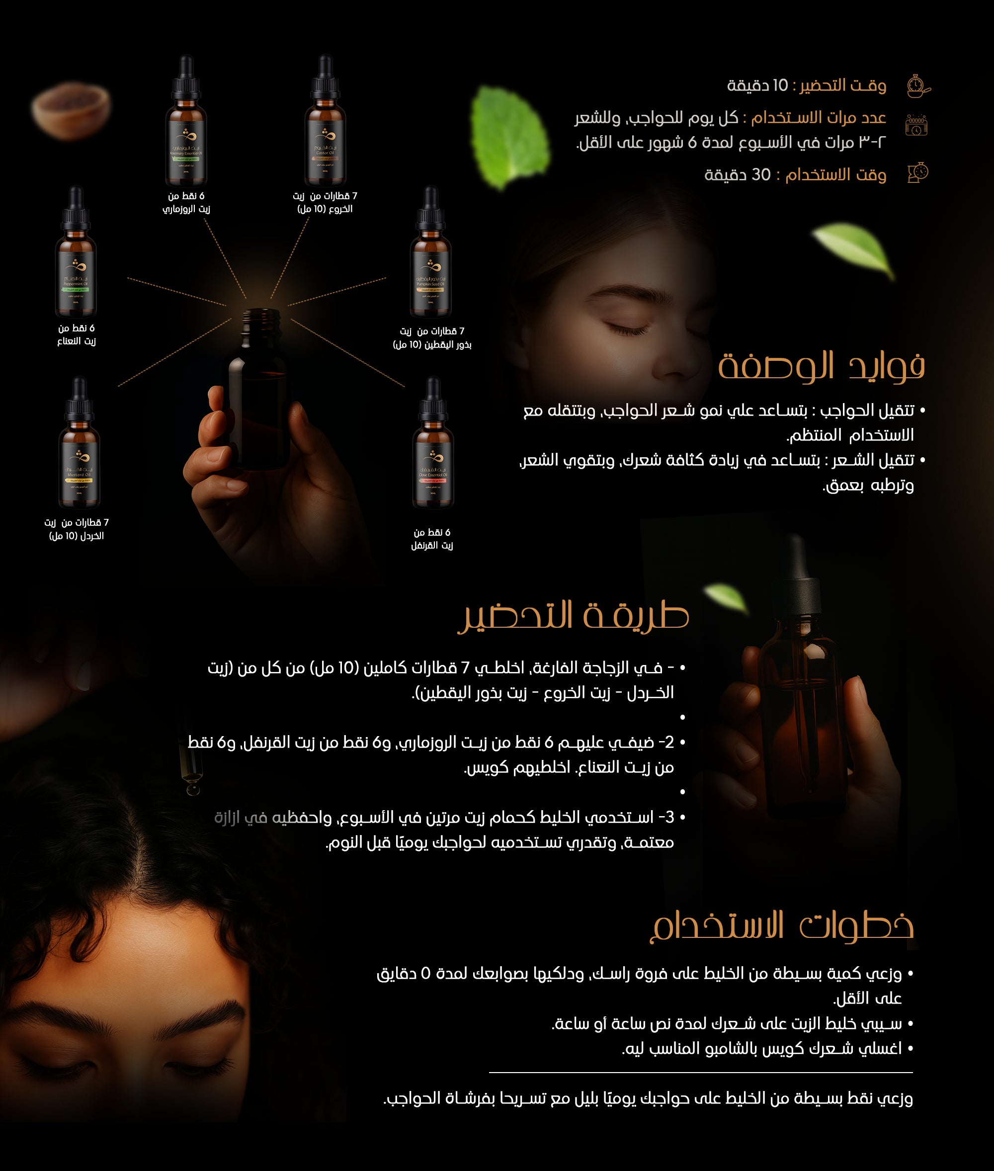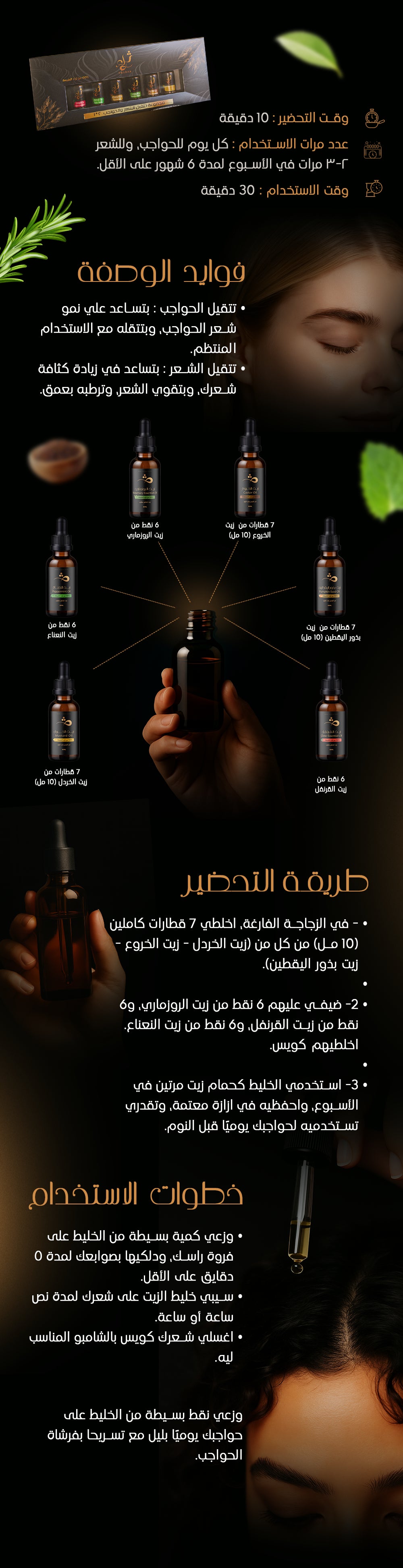 شعر حواجبك ممكن يضعف أو يتساقط نتيجة للشد المستمر، وهنا بتظهر أهمية زيت الروزماري لأنه من الزيوت اللي تمت عليها دراسات كتير وبالفعل تم إثبات تأثيرها القوي لتحفيز نمو الشعر وتقوية بصيلاته.